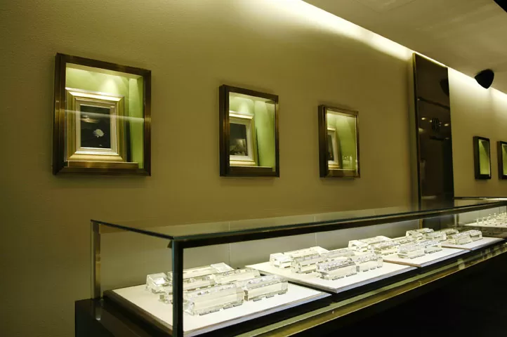 銀座にある直営店の店内には、以前このブログでも紹介した画家・アートディレクターの大藤雅幸氏がペイントしたショーケースが常設展示され、静寂さの中にも洗練された雰囲気が醸し出されています。