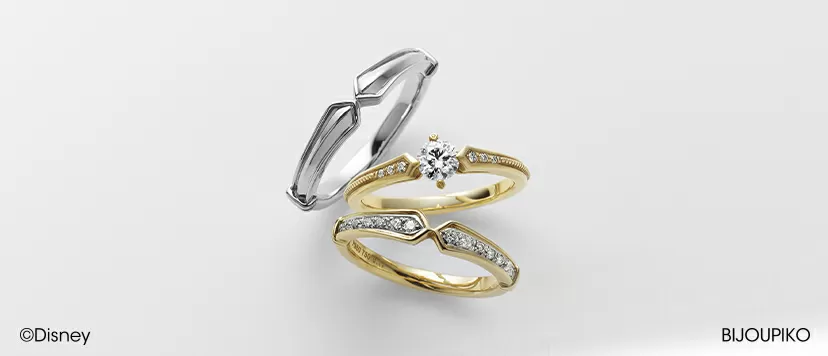 ディズニーに登場する優雅なプリンセス達が登場するエピソードを織り込んでつくられたロマンティックなリングは、幅広くずっと着けられる大人のためのデザインとなって輝きます。