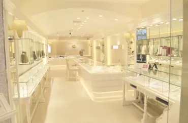 純白のチャペルをイメージした空間は、明るくアットホームなムードを演出。真実の愛にふさわしい指輪を提供するブランド『Veramore di nucled』をはじめ、婚約指輪のデザインは500種類以上、結婚指輪は20ブランド以上の豊富なデザインが揃う。ブライダルからアニバーサリーまで豊富な知識のスタッフとは一生のお付き合いも。